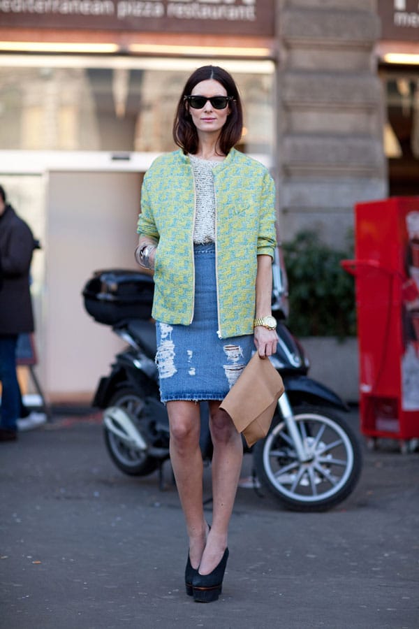 L’allure urbaine gagne encore en caractère avec une veste de motard en cuir noir superposée à une chemise à carreaux et une jupe crayon en denim déchiré. Les escarpins noirs pointus viennent affirmer une féminité sans concession.