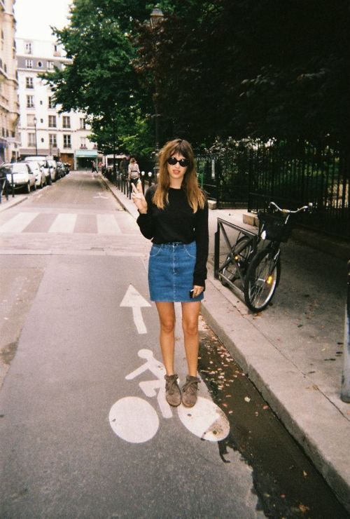 L’association d’un pull bleu ciel tout simple, une mini-jupe en jean et des bottines noires, c’est l’assurance d’un look décontracté, mais bien construit.