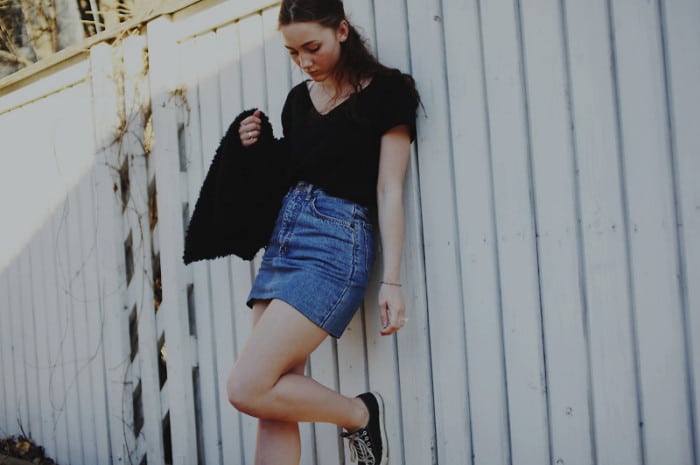 Parfois, il suffit de miser sur la simplicité : un pull noir, une jupe en jean, des bottes en daim, et l’ensemble fonctionne. Pas besoin d’artifices, le denim se suffit à lui-même.