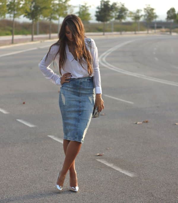 Envie d’un style sobre mais recherché ? Rien de plus efficace qu’une chemise blanche glissée dans une jupe crayon en denim déchiré. L’allure gagne en sophistication sans perdre son côté actuel.