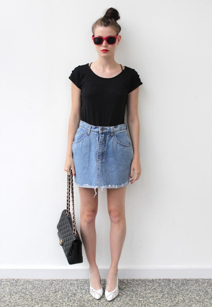 Envie d’un clin d’œil au grunge avec une touche contemporaine ? Glissez une chemise à carreaux dans une jupe en jean bleu clair, ajoutez des lunettes miroir et des escarpins noirs. L’ensemble frappe fort.