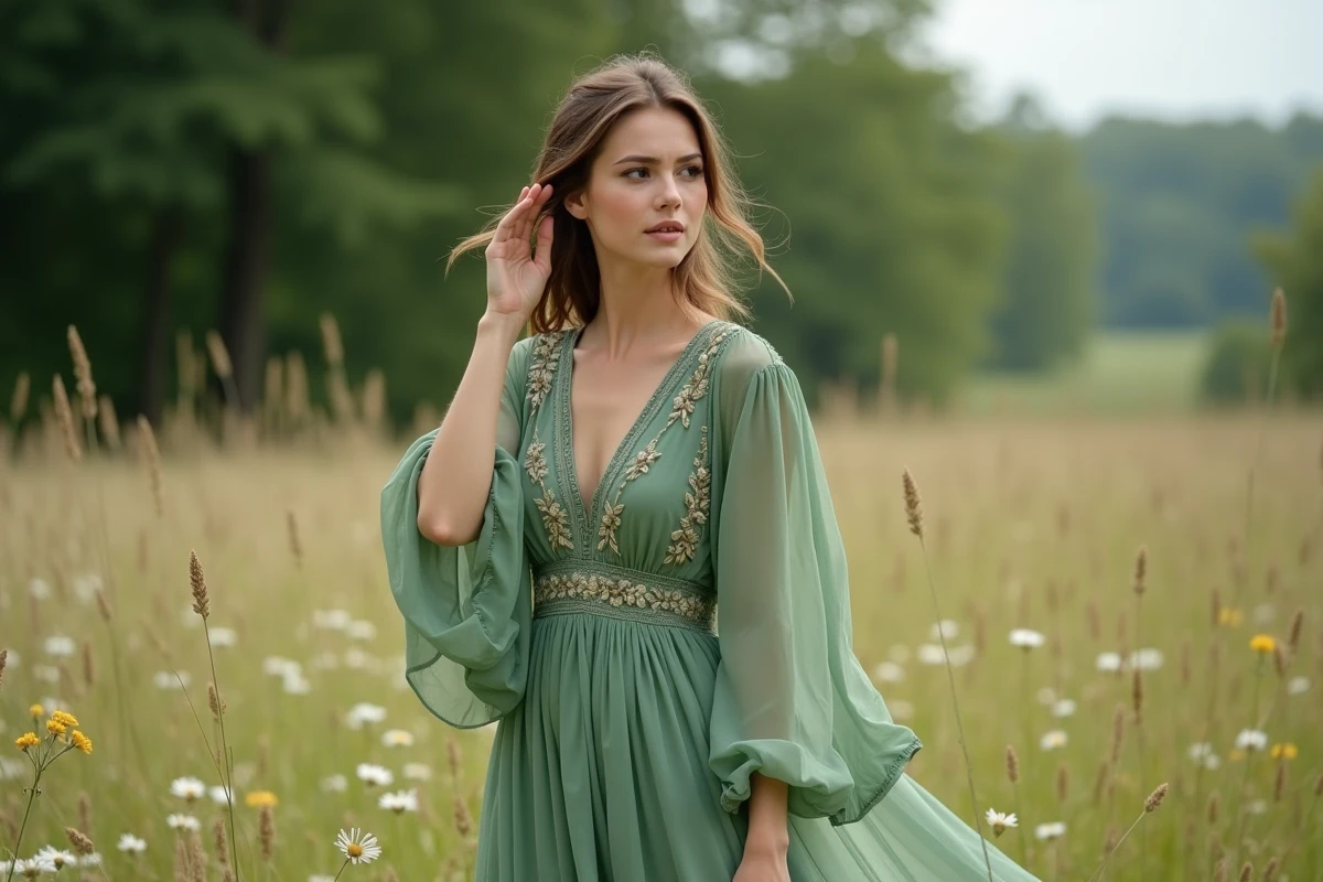 Ce qui fait la différence ? Un soin particulier des détails. Une ceinture de dentelle posée à la main, une encolure dessinée avec finesse, une jupe fluide qui semble suivre la brise. Porter une robe bohème verte, c’est affirmer une esthétique à la fois simple et exigeante, où la liberté prime sans négliger la structure. Le résultat : une allure qui traverse les modes, un choix de cœur qui reste intemporel.
